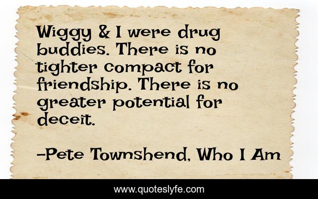 This page presents the quote "Wiggy & I were drug buddies. There is no tighter compact for friendship. There is no greater potential for deceit.". Author of this quote is Pete Townshend, Who I Am. This quote is about deceit, drugs, friendship,.