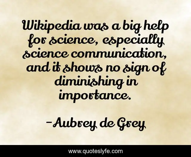 This page presents the quote "Wikipedia was a big help for science, especially science communication, and it shows no sign of diminishing in importance.". Author of this quote is Aubrey de Grey. This quote is about science, help, sign,.