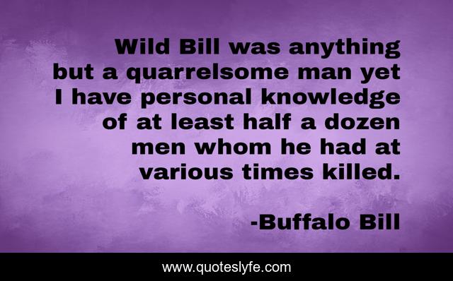 This page presents the quote "Wild Bill was anything but a quarrelsome man yet I have personal knowledge of at least half a dozen men whom he had at various times killed.". Author of this quote is Buffalo Bill. This quote is about personal, men, man,.