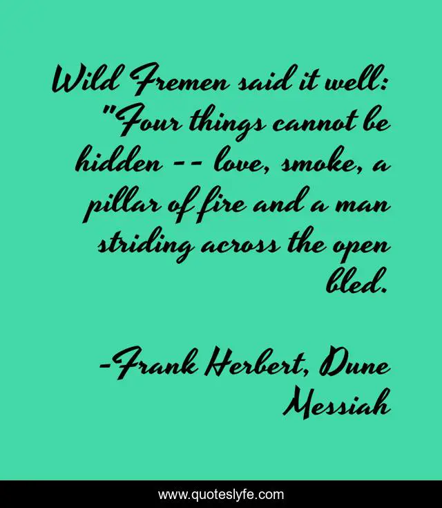 This page presents the quote "Wild Fremen said it well: "Four things cannot be hidden -- love, smoke, a pillar of fire and a man striding across the open bled.". Author of this quote is Frank Herbert, Dune Messiah. This quote is about fremen, love, fire, pillar, bled, smoke, open, affection,.