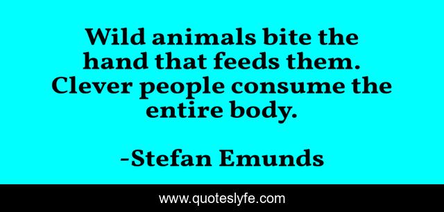 This page presents the quote "Wild animals bite the hand that feeds them. Clever people consume the entire body.". Author of this quote is Stefan Emunds. This quote is about preserve, nature, mankind-nature, wisdom, mankind, inspirational, planet-earth, enthusiasm, humanity,.