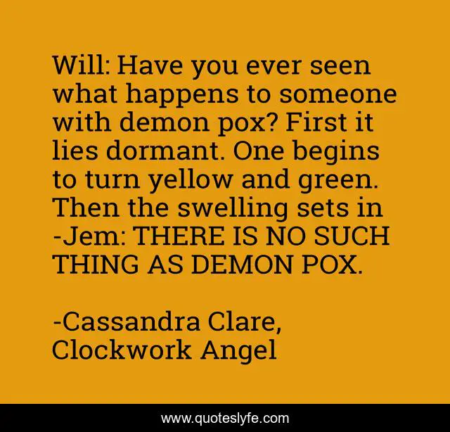 This page presents the quote "Will: Have you ever seen what happens to someone with demon pox? First it lies dormant. One begins to turn yellow and green. Then the swelling sets in -Jem: THERE IS NO SUCH THING AS DEMON POX.". Author of this quote is Cassandra Clare, Clockwork Angel. This quote is about demon-pox, jem,.