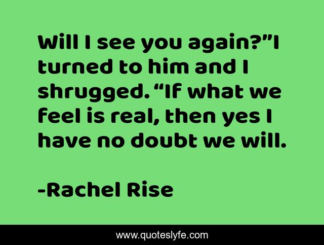 This page presents the quote "Will I see you again?”I turned to him and I shrugged. “If what we feel is real, then yes I have no doubt we will.". Author of this quote is Rachel Rise. .