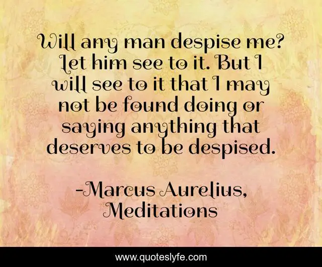 This page presents the quote "Will any man despise me? Let him see to it. But I will see to it that I may not be found doing or saying anything that deserves to be despised.". Author of this quote is Marcus Aurelius, Meditations. This quote is about hatred, morality, behavior, self-worth,.
