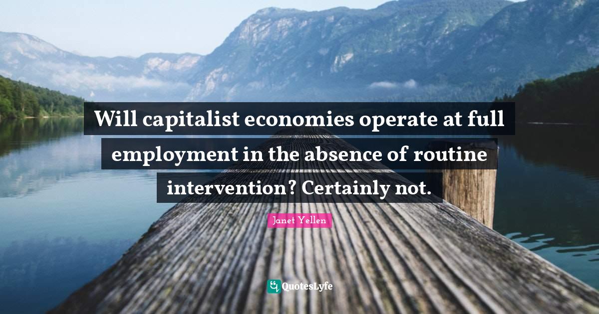 This page presents the quote "Will capitalist economies operate at full employment in the absence of routine intervention? Certainly not.". Author of this quote is Janet Yellen. This quote is about capitalist economy, absence, intervention, capitalist, employment, routine,.
