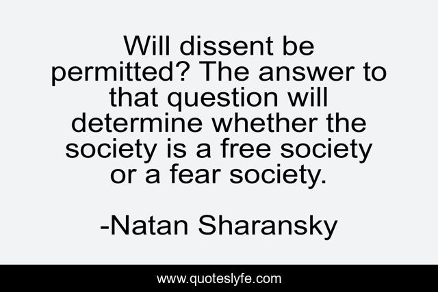 This page presents the quote "Will dissent be permitted? The answer to that question will determine whether the society is a free society or a fear society.". Author of this quote is Natan Sharansky. This quote is about society, question, free,.
