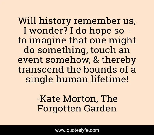 "Kate Morton, The Forgotten Garden Quotes." Quoteslyfe.com, 2025. Mon. 08 Dec. 2025. <https://www.quoteslyfe.com/quote/Will-history-remember-us-I-wonder-I-70255>.