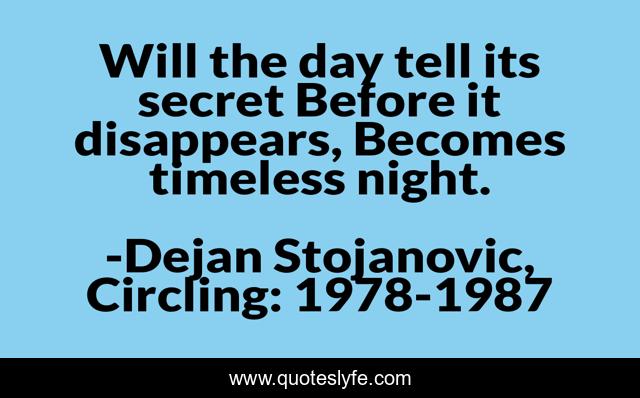 This page presents the quote "Will the day tell its secret Before it disappears, Becomes timeless night.". Author of this quote is Dejan Stojanovic, Circling: 1978-1987. This quote is about literature, disappearance, dejan-stojanovic, timeless, poetry, wisdom, quotes, secret, circling,.