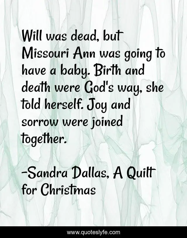 This page presents the quote "Will was dead, but Missouri Ann was going to have a baby. Birth and death were God's way, she told herself. Joy and sorrow were joined together.". Author of this quote is Sandra Dallas, A Quilt for Christmas. This quote is about death, birth,.