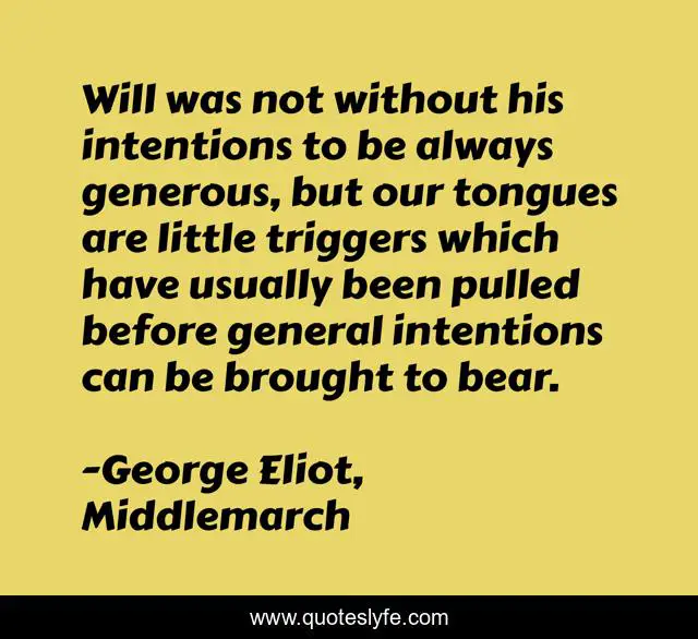 This page presents the quote "Will was not without his intentions to be always generous, but our tongues are little triggers which have usually been pulled before general intentions can be brought to bear.". Author of this quote is George Eliot, Middlemarch. This quote is about speech, self-control,.