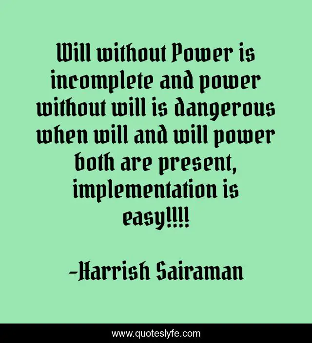 "Harrish Sairaman Quotes." Quoteslyfe.com, 2025. Fri. 05 Dec. 2025. <https://www.quoteslyfe.com/quote/Will-without-Power-is-incomplete-and-power-212916>.