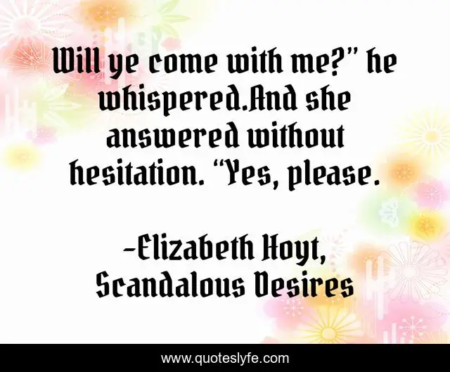 This page presents the quote "Will ye come with me?” he whispered.And she answered without hesitation. “Yes, please.". Author of this quote is Elizabeth Hoyt, Scandalous Desires. This quote is about mickey, scandalous-desires, elizabeth-hoyt, silence,.