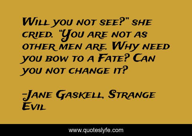 This page presents the quote "Will you not see?” she cried. “You are not as other men are. Why need you bow to a Fate? Can you not change it?". Author of this quote is Jane Gaskell, Strange Evil. This quote is about destiny, fate,.