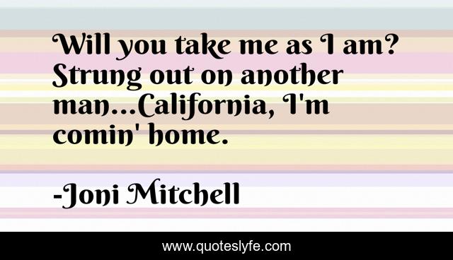 This page presents the quote "Will you take me as I am? Strung out on another man...California, I'm comin' home.". Author of this quote is Joni Mitchell. .