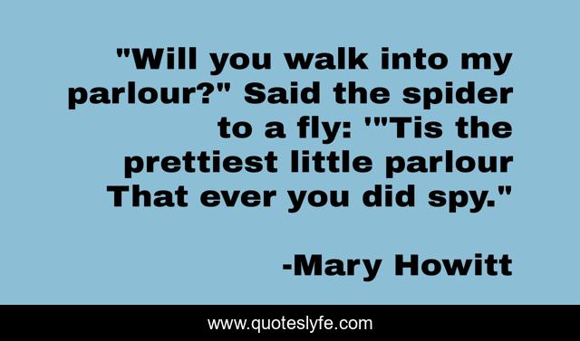 This page presents the quote ""Will you walk into my parlour?" Said the spider to a fly: '"Tis the prettiest little parlour That ever you did spy."". Author of this quote is Mary Howitt. .