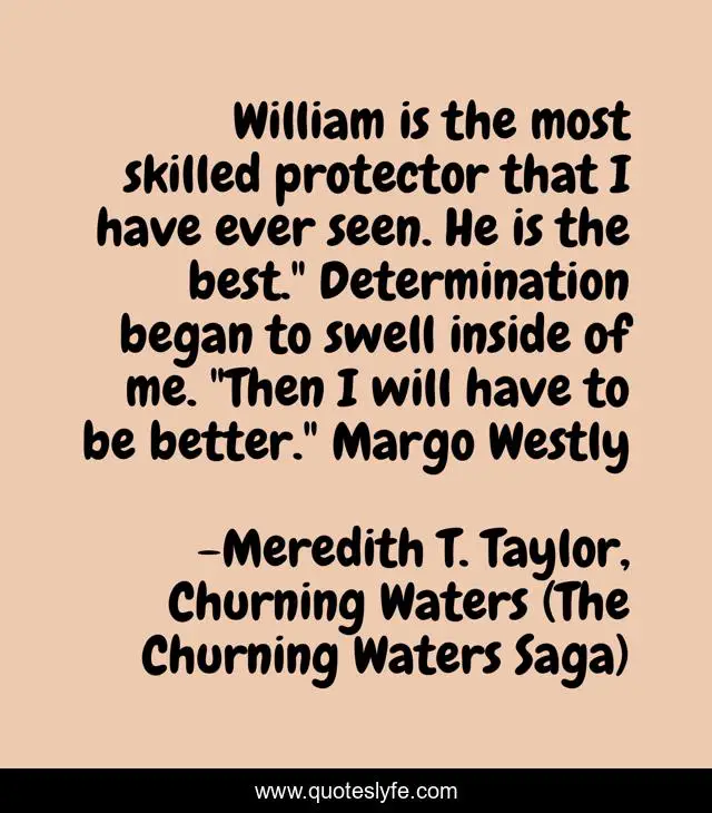 This page presents the quote "William is the most skilled protector that I have ever seen. He is the best." Determination began to swell inside of me. "Then I will have to be better." Margo Westly". Author of this quote is Meredith T. Taylor, Churning Waters (The Churning Waters Saga). This quote is about strength-of-spirit, strength, strength-of-character, lovers-sadness, love-hurts, strength-and-courage,.