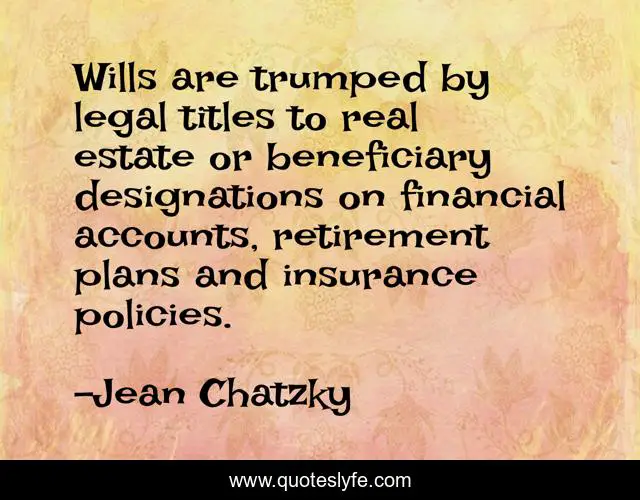This page presents the quote "Wills are trumped by legal titles to real estate or beneficiary designations on financial accounts, retirement plans and insurance policies.". Author of this quote is Jean Chatzky. This quote is about financial, real estate,.