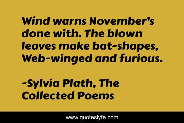 This page presents the quote "Wind warns November’s done with. The blown leaves make bat-shapes, Web-winged and furious.". Author of this quote is Sylvia Plath, The Collected Poems. This quote is about bat, leaves, autumn, bats, foliage, fall, dialogue-over-a-ouija-board, november, wind,.