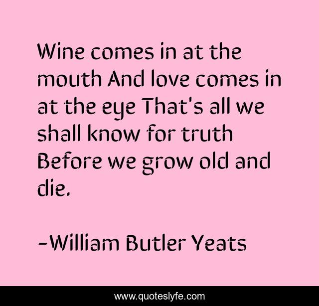 This page presents the quote "Wine comes in at the mouth And love comes in at the eye That's all we shall know for truth Before we grow old and die.". Author of this quote is William Butler Yeats. This quote is about dating, love, affection, wine,.