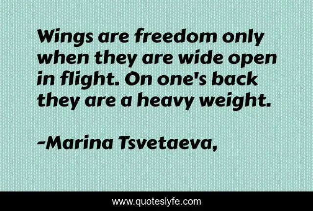This page presents the quote "Wings are freedom only when they are wide open in flight. On one's back they are a heavy weight.". Author of this quote is Marina Tsvetaeva, Сводные тетради. This quote is about freedom, choice,.