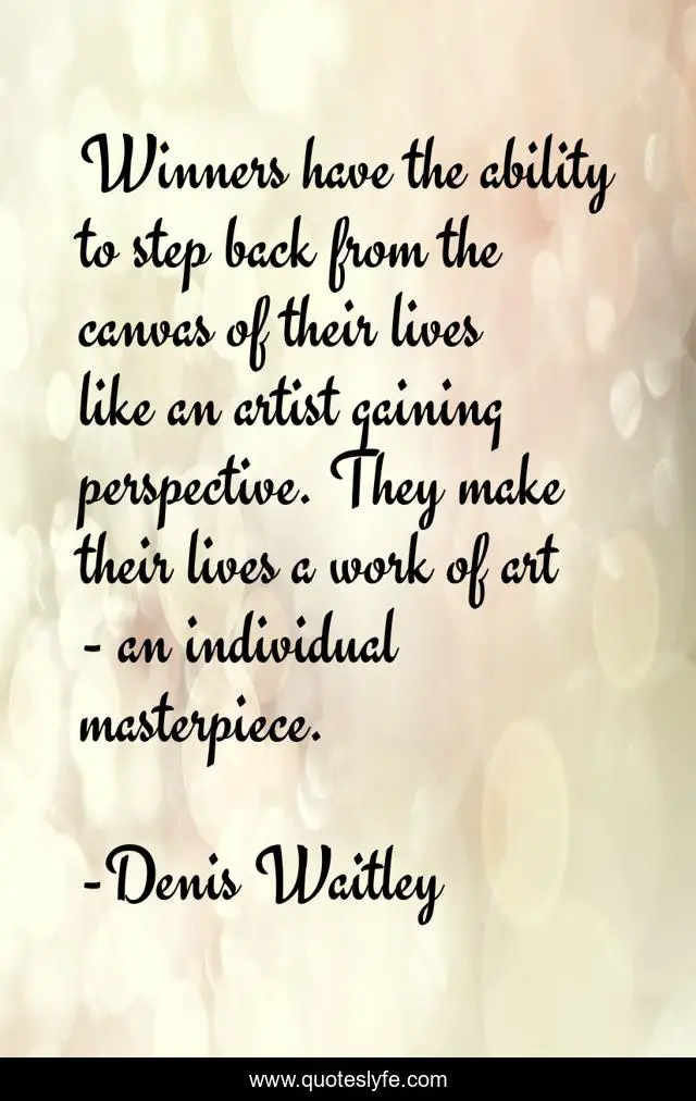 This page presents the quote "Winners have the ability to step back from the canvas of their lives like an artist gaining perspective. They make their lives a work of art - an individual masterpiece.". Author of this quote is Denis Waitley. This quote is about work, perspective, artist,.