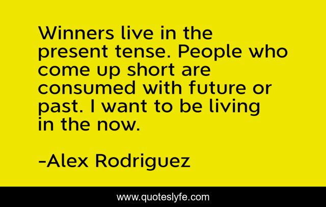 This page presents the quote "Winners live in the present tense. People who come up short are consumed with future or past. I want to be living in the now.". Author of this quote is Alex Rodriguez. This quote is about past, short, people,.