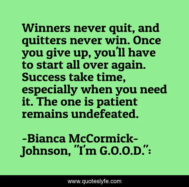 This page presents the quote "Winners never quit, and quitters never win. Once you give up, you'll have to start all over again. Success take time, especially when you need it. The one is patient remains undefeated.". Author of this quote is Bianca McCormick-Johnson, "I'm G.O.O.D.":. This quote is about inspiring, motivational-inspirational, motivational, confidence, optimistic, inspirational, positive, enthusiasm,.