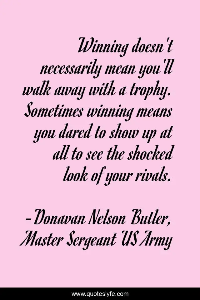This page presents the quote "Winning doesn't necessarily mean you'll walk away with a trophy. Sometimes winning means you dared to show up at all to see the shocked look of your rivals.". Author of this quote is Donavan Nelson Butler, Master Sergeant US Army. This quote is about dignity, army, wisdom, perceverance, leadership-traits, self-esteem,.