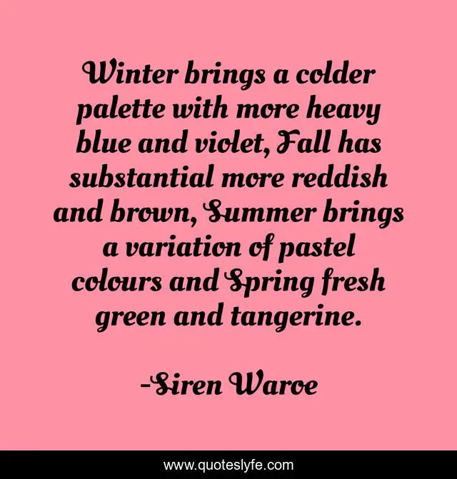 This page presents the quote "Winter brings a colder palette with more heavy blue and violet, Fall has substantial more reddish and brown, Summer brings a variation of pastel colours and Spring fresh green and tangerine.". Author of this quote is Siren Waroe. This quote is about colours, seasons, palette, art, inspiration,.