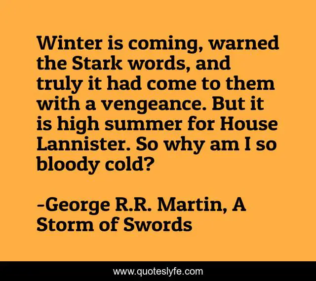 This page presents the quote "Winter is coming, warned the Stark words, and truly it had come to them with a vengeance. But it is high summer for House Lannister. So why am I so bloody cold?". Author of this quote is George R.R. Martin, A Storm of Swords. This quote is about summer, winter, stark, lannister, coming, cold, vengeance,.