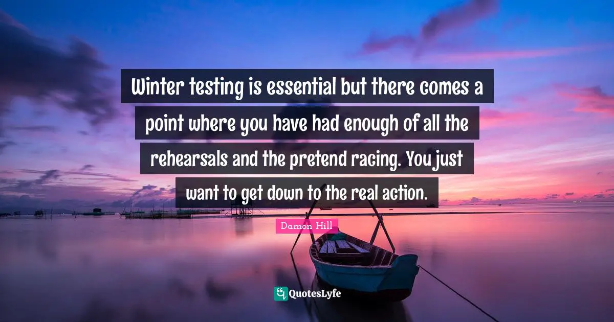 This page presents the quote "Winter testing is essential but there comes a point where you have had enough of all the rehearsals and the pretend racing. You just want to get down to the real action.". Author of this quote is Damon Hill. This quote is about winter, action, had enough, athlete, racing, sports, want, real, testing,.