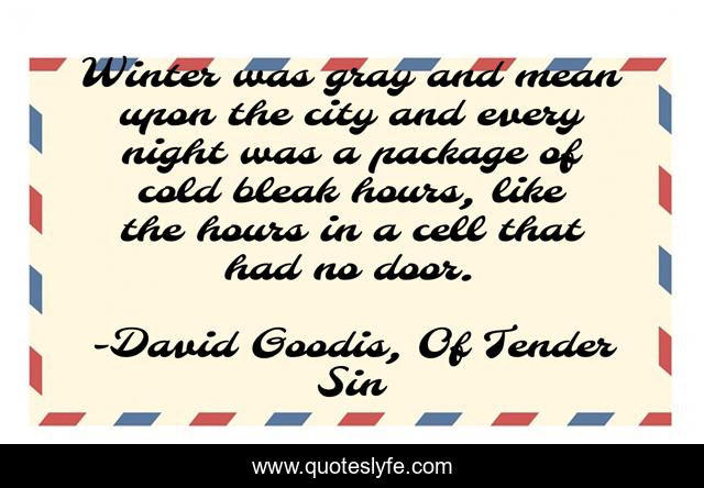 This page presents the quote "Winter was gray and mean upon the city and every night was a package of cold bleak hours, like the hours in a cell that had no door.". Author of this quote is David Goodis, Of Tender Sin. This quote is about city, noir, winter, urban,.
