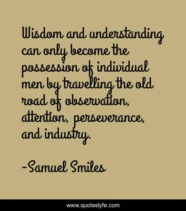 This page presents the quote "Wisdom and understanding can only become the possession of individual men by travelling the old road of observation, attention, perseverance, and industry.". Author of this quote is Samuel Smiles. This quote is about perseverance, men, road,.