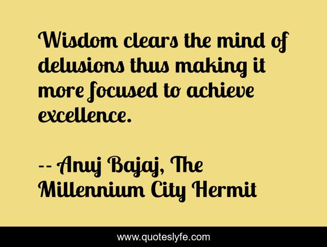 This page presents the quote "Wisdom clears the mind of delusions thus making it more focused to achieve excellence.". Author of this quote is - Anuj Bajaj, The Millennium City Hermit. This quote is about the-millennium-city-hermit, excellence, wisdom,.