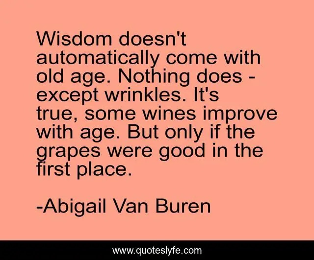 This page presents the quote "Wisdom doesn't automatically come with old age. Nothing does - except wrinkles. It's true, some wines improve with age. But only if the grapes were good in the first place.". Author of this quote is Abigail Van Buren. This quote is about life, passion, adventure,.