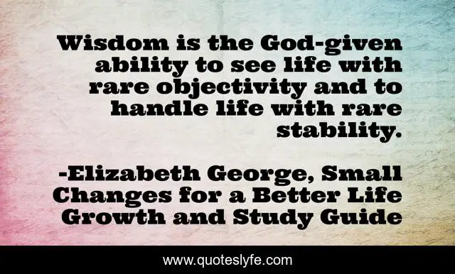 This page presents the quote "Wisdom is the God-given ability to see life with rare objectivity and to handle life with rare stability.". Author of this quote is Elizabeth George, Small Changes for a Better Life Growth and Study Guide. This quote is about faith, life, christian, ability, joy, peace, wisdom, stability, see,.