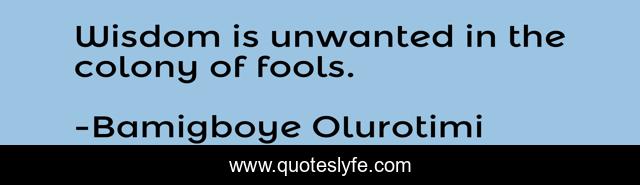 This page presents the quote "Wisdom is unwanted in the colony of fools.". Author of this quote is Bamigboye Olurotimi. This quote is about life, places, company, colony, foolishness, wisdom, choice, companion, understanding,.