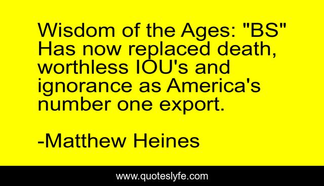 This page presents the quote "Wisdom of the Ages: "BS" Has now replaced death, worthless IOU's and ignorance as America's number one export.". Author of this quote is Matthew Heines. .