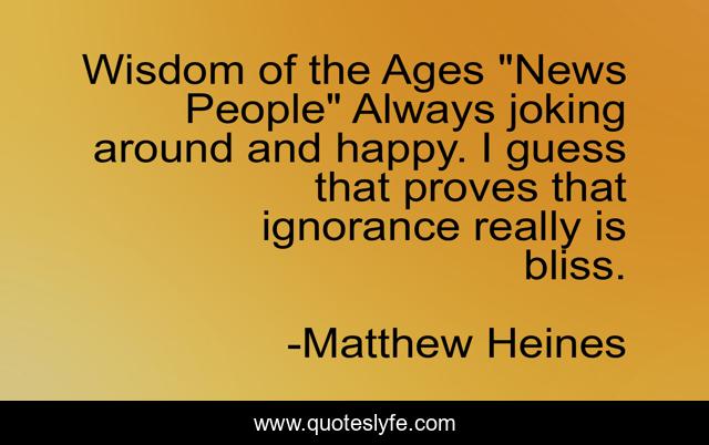 This page presents the quote "Wisdom of the Ages "News People" Always joking around and happy. I guess that proves that ignorance really is bliss.". Author of this quote is Matthew Heines. This quote is about cnn, humorous, humor, media-distortion, fox-news,.