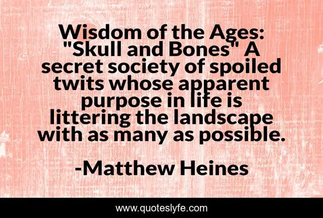 This page presents the quote "Wisdom of the Ages: "Skull and Bones" A secret society of spoiled twits whose apparent purpose in life is littering the landscape with as many as possible.". Author of this quote is Matthew Heines. This quote is about funny, humor, humorous, funny-but-true, funny-but-sad, comedy,.
