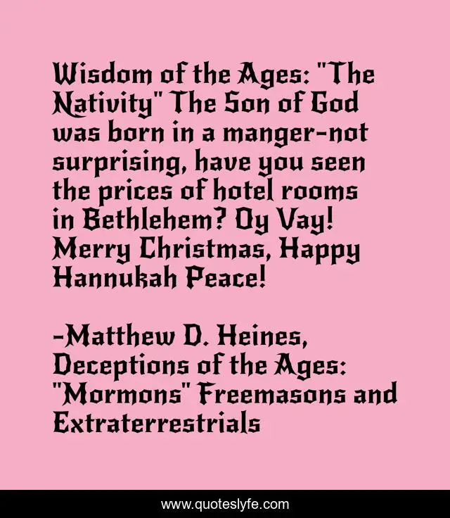 This page presents the quote "Wisdom of the Ages: "The Nativity" The Son of God was born in a manger-not surprising, have you seen the prices of hotel rooms in Bethlehem? Oy Vay! Merry Christmas, Happy Hannukah Peace!". Author of this quote is Matthew D. Heines, Deceptions of the Ages: "Mormons" Freemasons and Extraterrestrials. This quote is about humorous, nativity, bethlehem, christmas,.