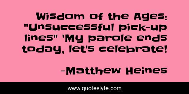 This page presents the quote "Wisdom of the Ages: "Unsuccessful pick-up lines" 'My parole ends today, let's celebrate!". Author of this quote is Matthew Heines. This quote is about humorous, funny, humorist, comedy,.