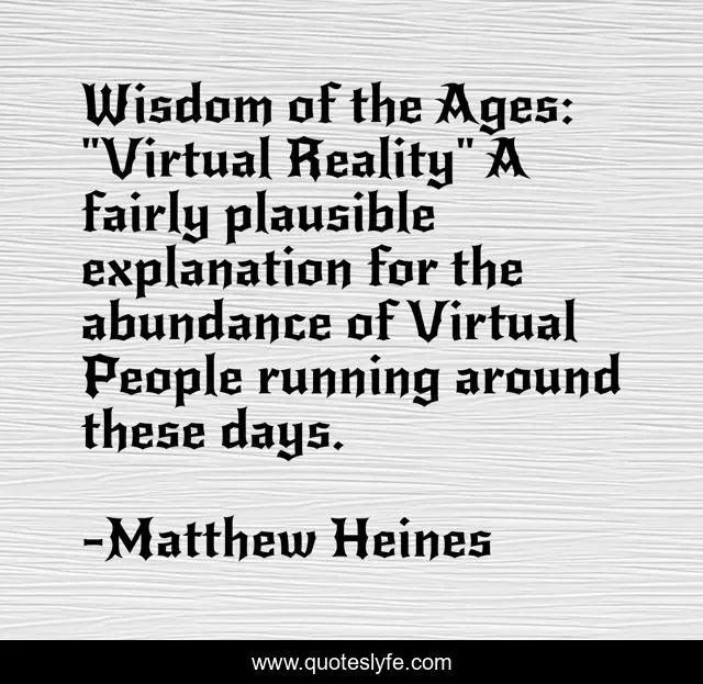 This page presents the quote "Wisdom of the Ages: "Virtual Reality" A fairly plausible explanation for the abundance of Virtual People running around these days.". Author of this quote is Matthew Heines. This quote is about humorous, virtual-reality,.