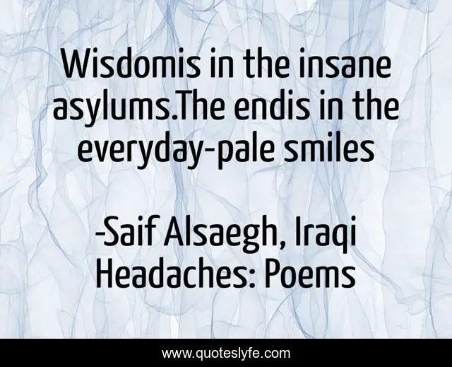 This page presents the quote "Wisdomis in the insane asylums.The endis in the everyday-pale smiles". Author of this quote is Saif Alsaegh, Iraqi Headaches: Poems. This quote is about poetry, iraqi-headaches,.