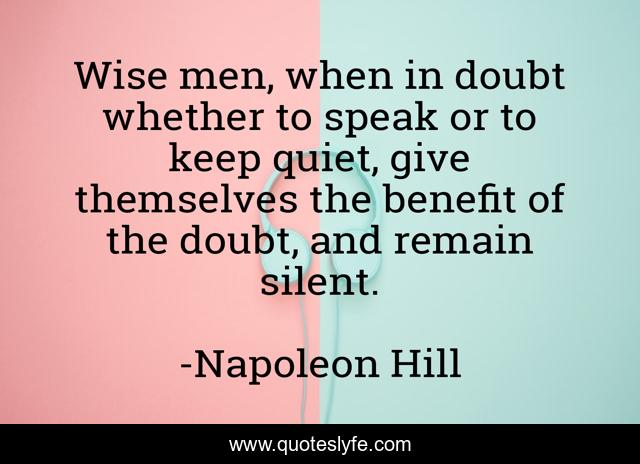 This page presents the quote "Wise men, when in doubt whether to speak or to keep quiet, give themselves the benefit of the doubt, and remain silent.". Author of this quote is Napoleon Hill. This quote is about silence, wisdom,.