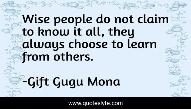 This page presents the quote "Wise people do not claim to know it all, they always choose to learn from others.". Author of this quote is Gift Gugu Mona. This quote is about claim, wisdom-inspirational, know-it-all, choose, learn-from-others, wise-people,.