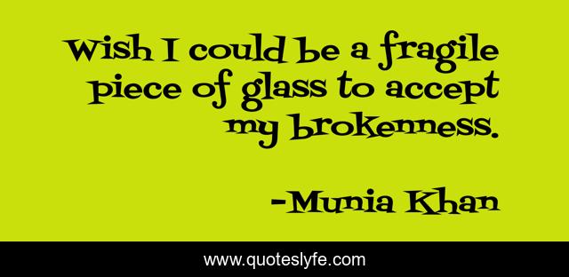 This page presents the quote "Wish I could be a fragile piece of glass to accept my brokenness.". Author of this quote is Munia Khan. This quote is about brokenness, broken, wish, fragile, broken-glass, glass, piece,.