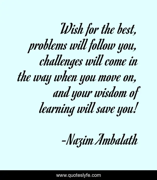 This page presents the quote "Wish for the best, problems will follow you, challenges will come in the way when you move on, and your wisdom of learning will save you!". Author of this quote is Nazim Ambalath. This quote is about challenges, learning-process, wisdom,.