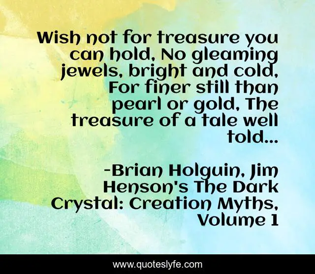 This page presents the quote "Wish not for treasure you can hold, No gleaming jewels, bright and cold, For finer still than pearl or gold, The treasure of a tale well told...". Author of this quote is Brian Holguin, Jim Henson's The Dark Crystal: Creation Myths, Volume 1. .