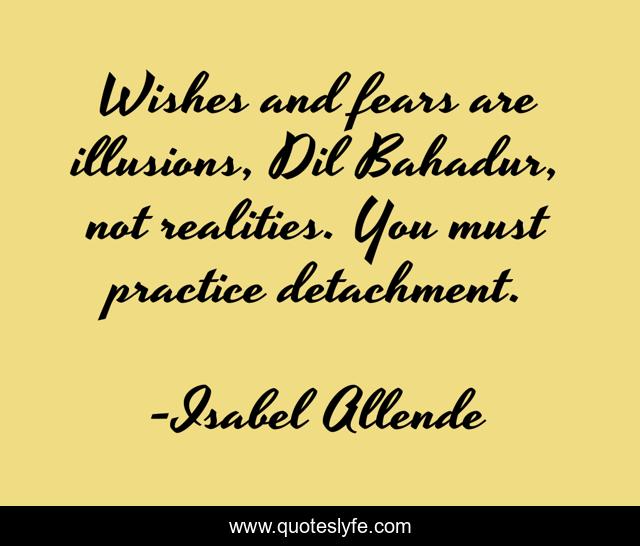This page presents the quote "Wishes and fears are illusions, Dil Bahadur, not realities. You must practice detachment.". Author of this quote is Isabel Allende. This quote is about emotion, wish, fear,.